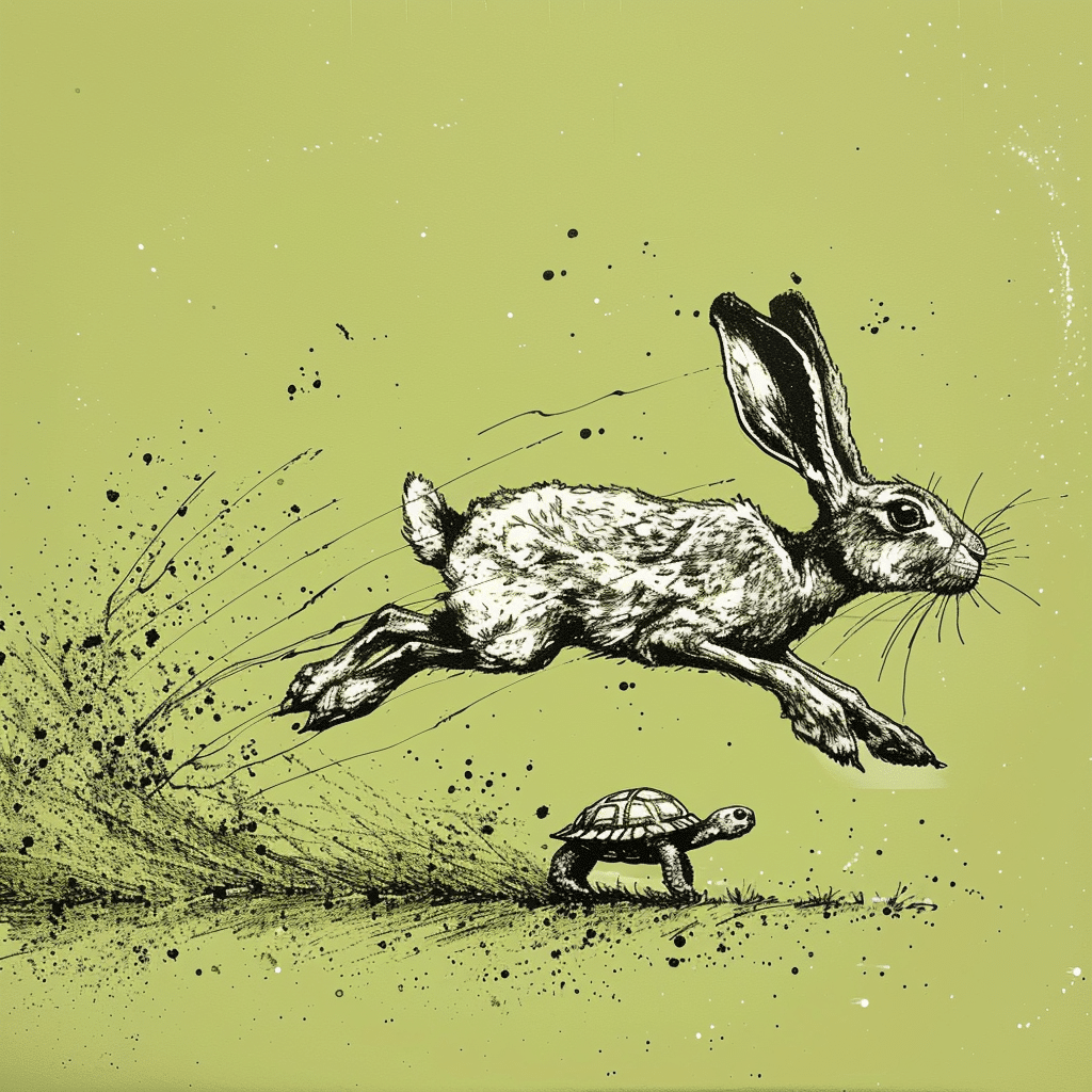 在一個熱鬧的森林裡,住著一隻跑得非常、非常快的兔子。他對自己的速度超級有自信,常常掛在嘴邊炫耀:「我跟你們說,我跑起來像一陣風!森林裡絕對沒有人跑得贏我!」 兔子聽到這句話,先是愣了一下,然後捧著肚子哈哈大笑,笑到眼淚都流出來了!「什麼?我沒聽錯吧?你要跟我比賽跑?哈哈哈,這真是天底下最好笑的笑話了!」…