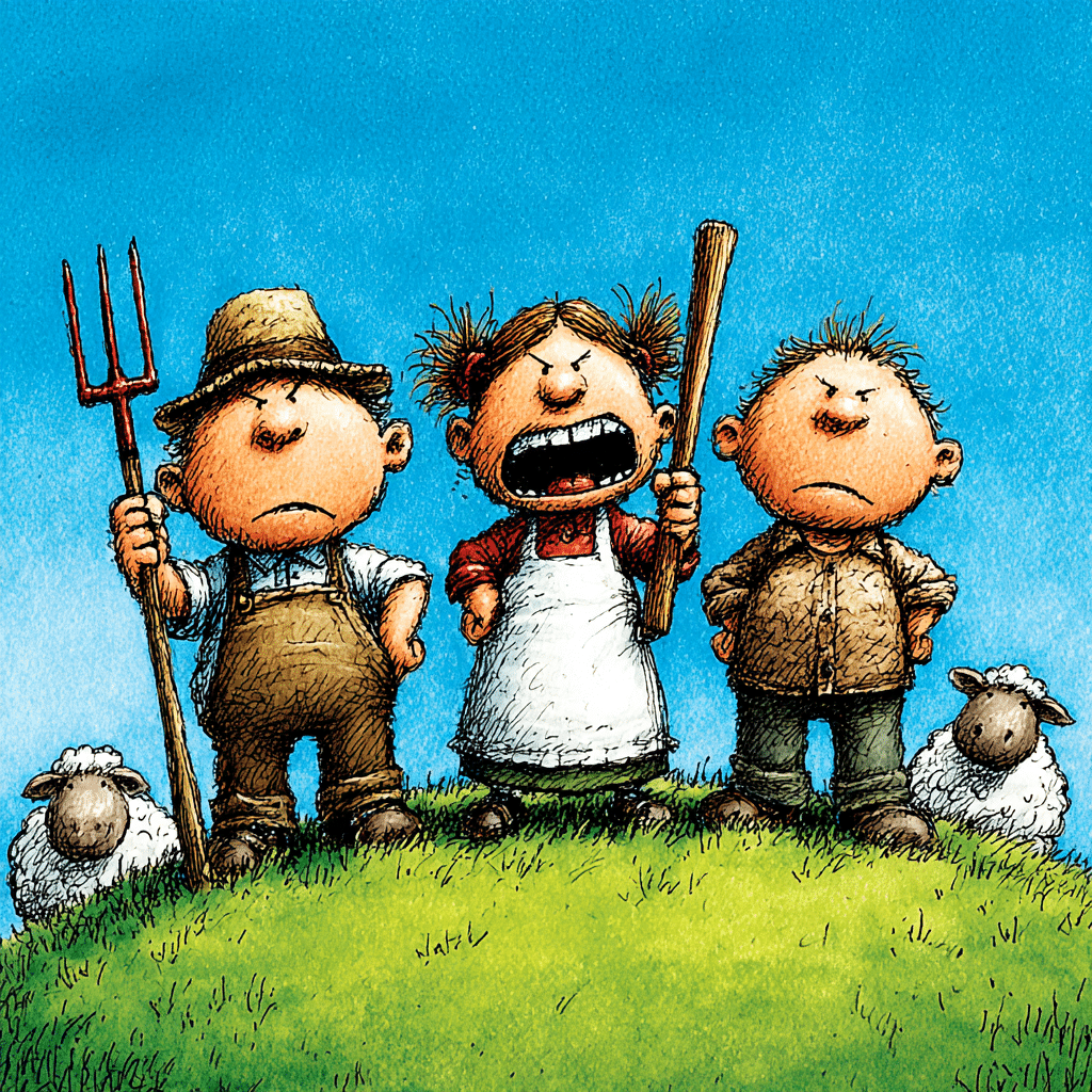 村子裡的農夫們聽到了,都嚇了一大跳!他們心想:「不得了!村子裡的羊要是被吃光了該怎麼辦!」大家立刻放下手邊的工作,拿起鋤頭、鏟子,氣喘轆轆地往山坡上衝,準備要一起打跑大野狼。