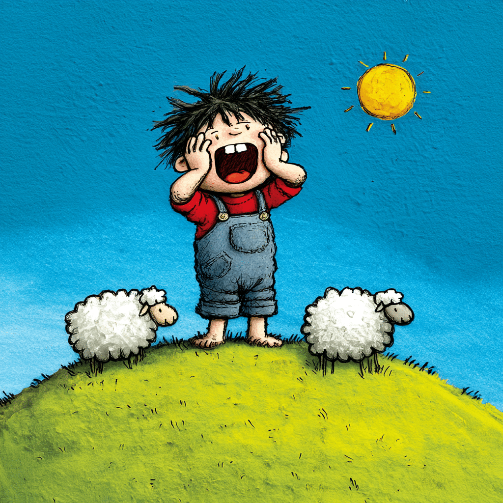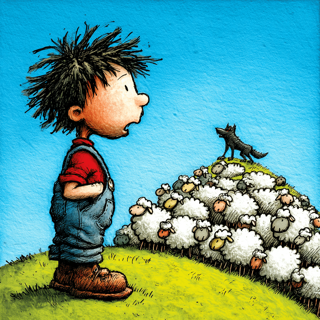 於是,他從草地上一躍而起,假裝非常驚慌的樣子,朝著山下的村子用盡全力大喊:「狼來了——!狼來了——!救命啊!有大野狼要來吃我的羊了!」