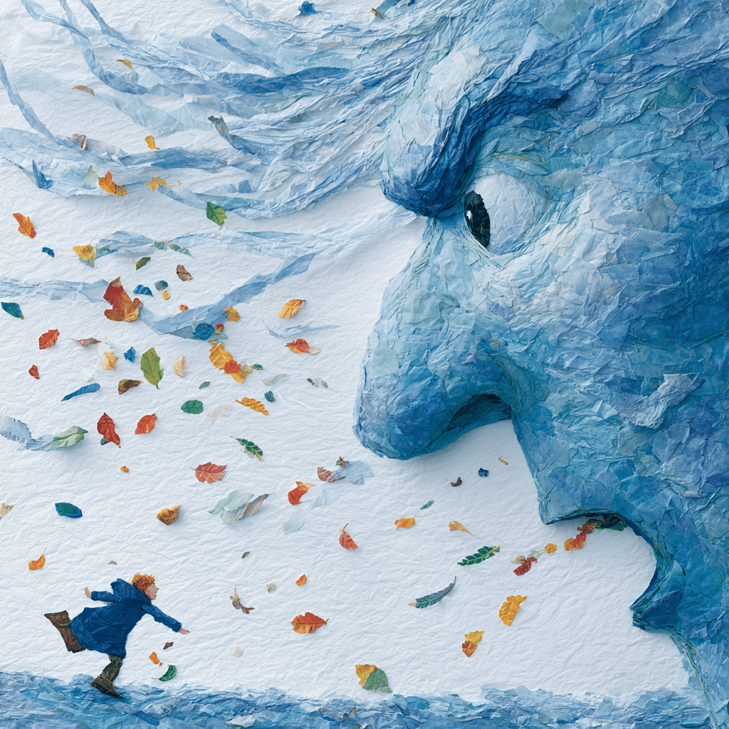 一個是北風,他總是「呼——呼——呼——」的吹著氣,個性有點急,也很愛生氣。他最喜歡對大家炫耀說:「我跟你們說,我才是這個世界上最強的!你看我隨便一吹,大樹都要彎腰,小草都嚇得趴在地上!」