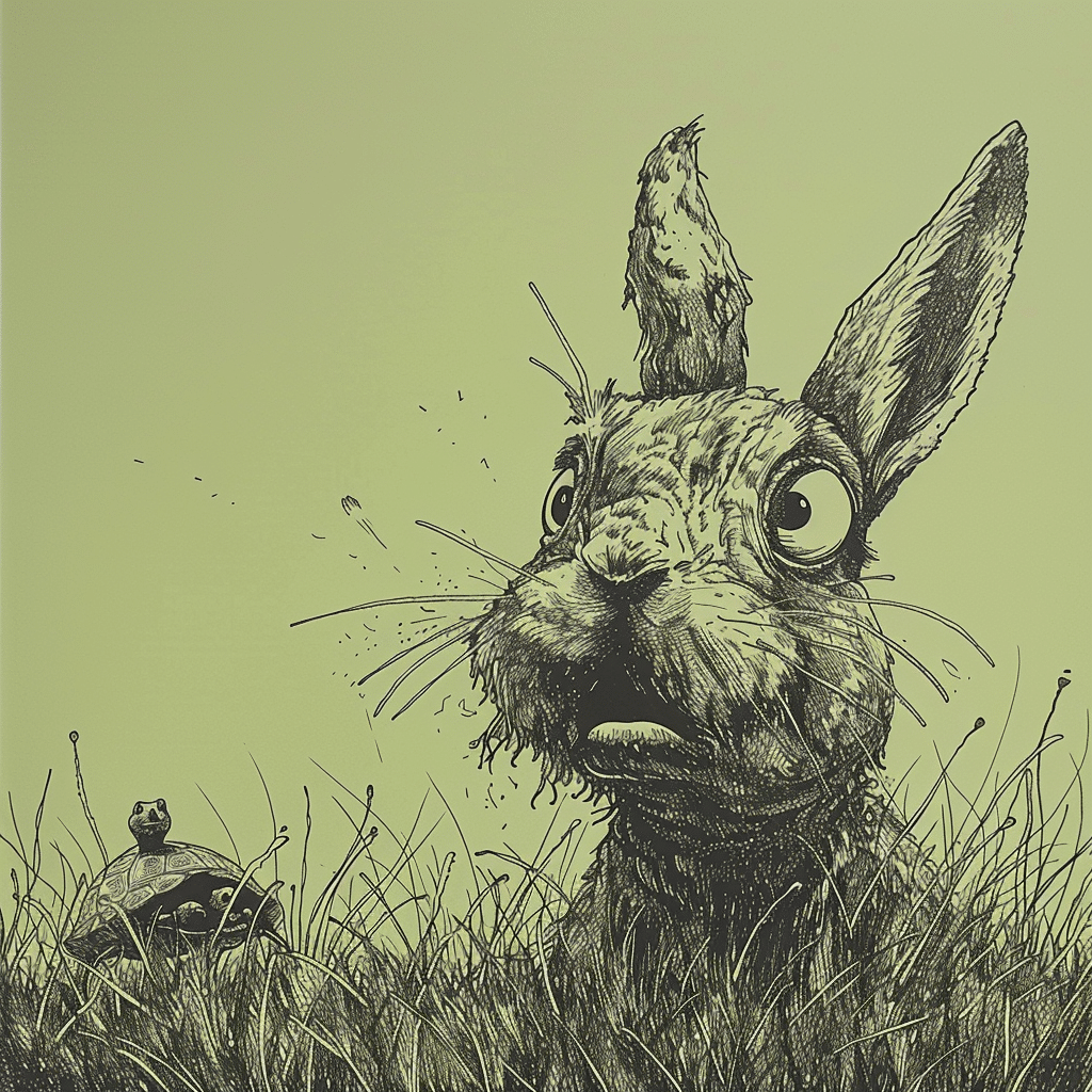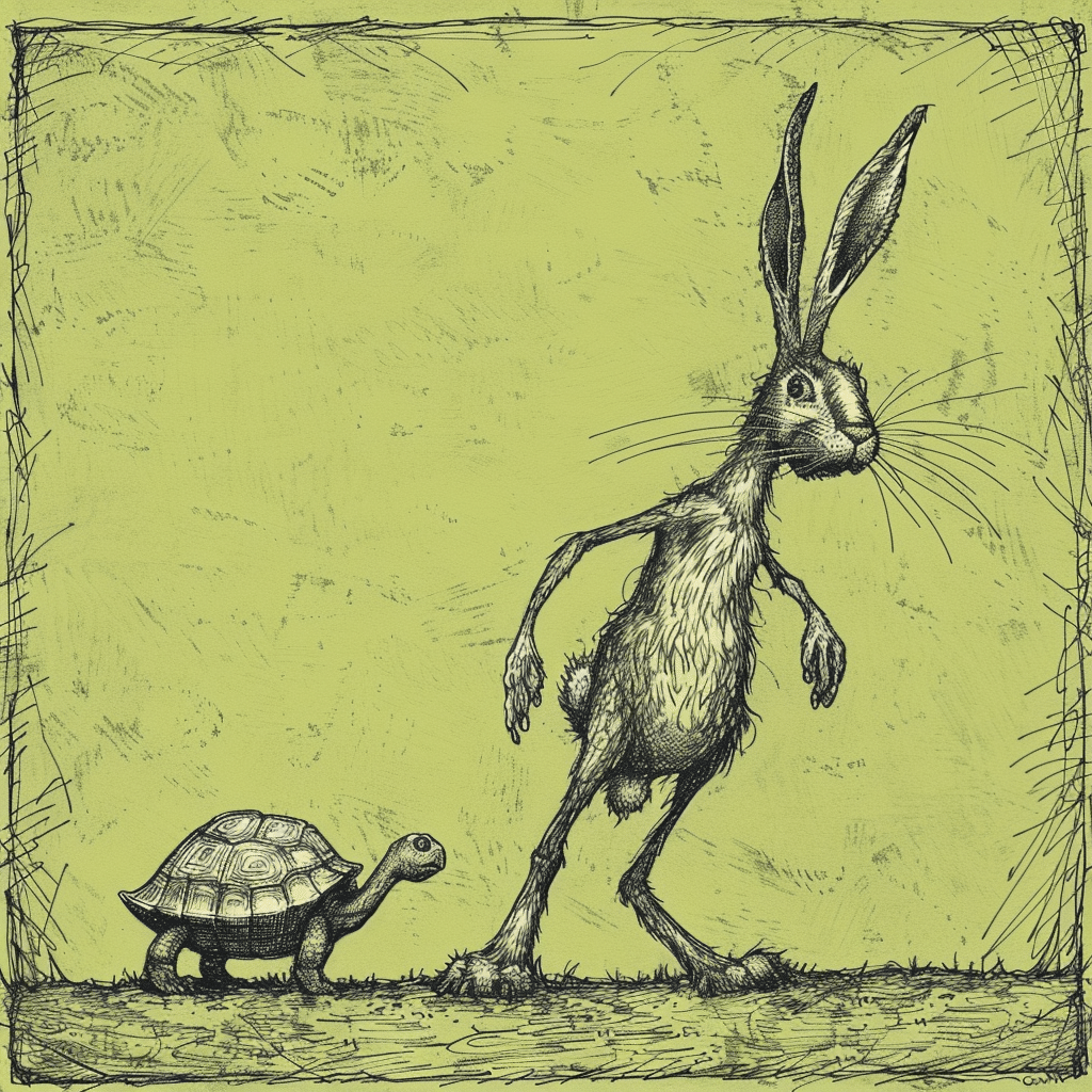 而那隻驕傲的兔子,只能氣喘吁吁地跪在終點線前,一句話都說不出來。他明明是跑得最快的,最後卻輸了比賽。