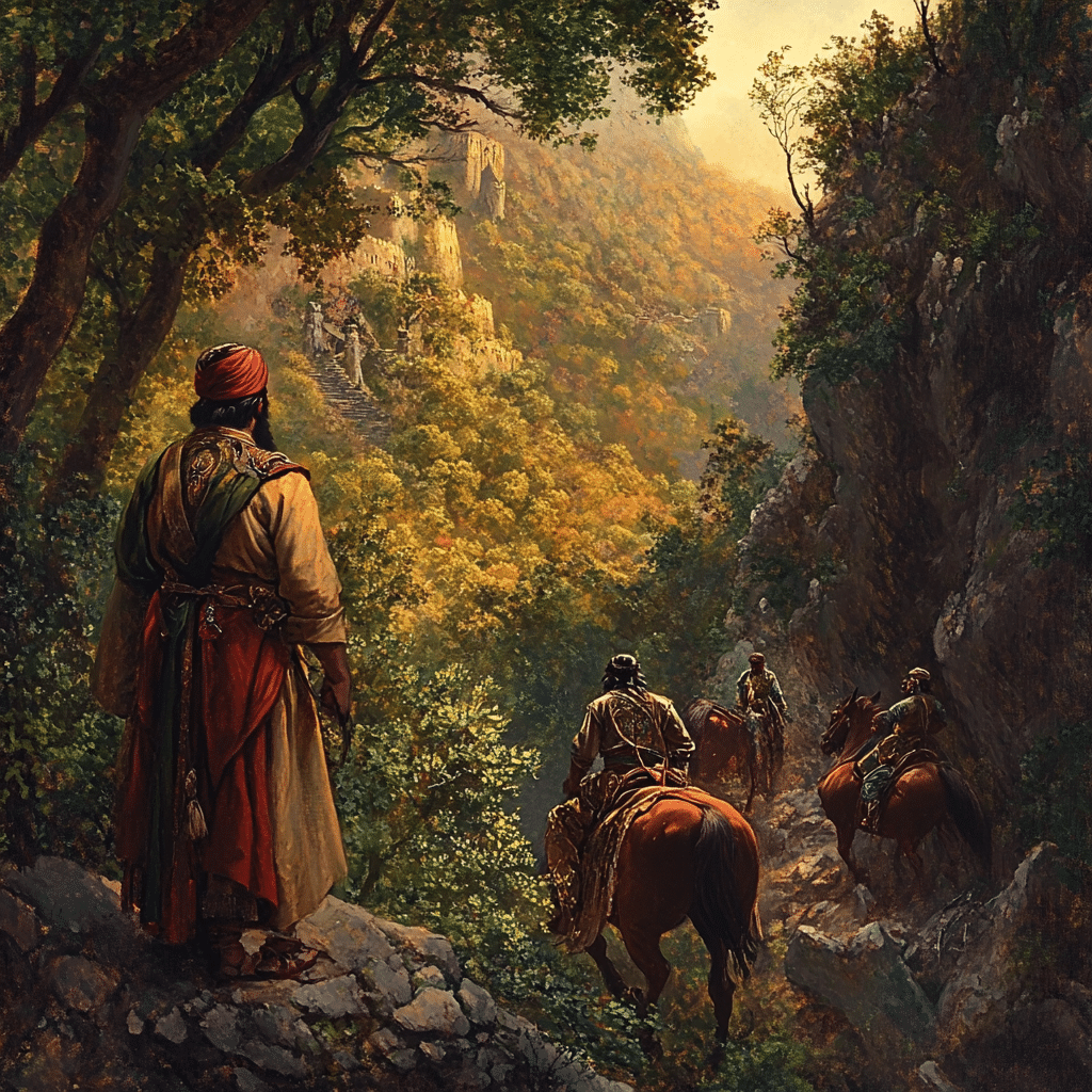 阿里巴巴拖著疲憊的身軀,踏過山間曲折的小徑。他是個貧苦的樵夫,每天日出而作,日落而息,只為養活家中妻小。這一天,太陽已經西沉,他收拾好砍柴工具,正準備返家。突然,遠處傳來馬蹄聲和男人們粗獷的談笑聲。