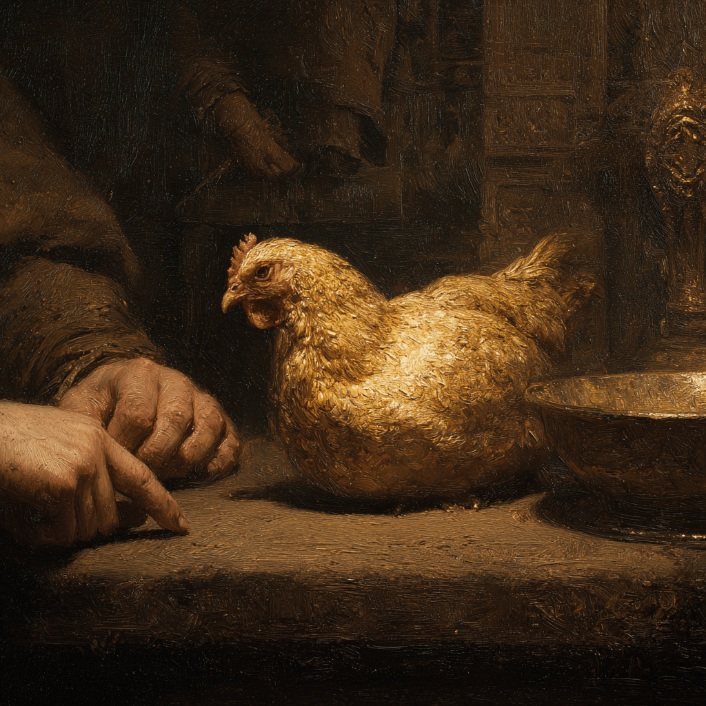 母雞立刻挺直了身子,”咯咯咯”叫了幾聲,接著…真的下了一個金燦燦的蛋!