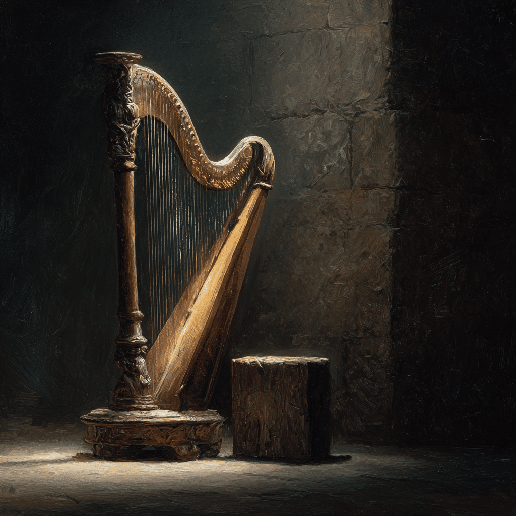 城堡裡安安靜靜的,只有巨人的鼾聲從臥室傳來。豎琴靜靜地立在桌上,金色的琴身在陽光下閃閃發亮。傑克正要靠近,突然聽見廚房傳來腳步聲。