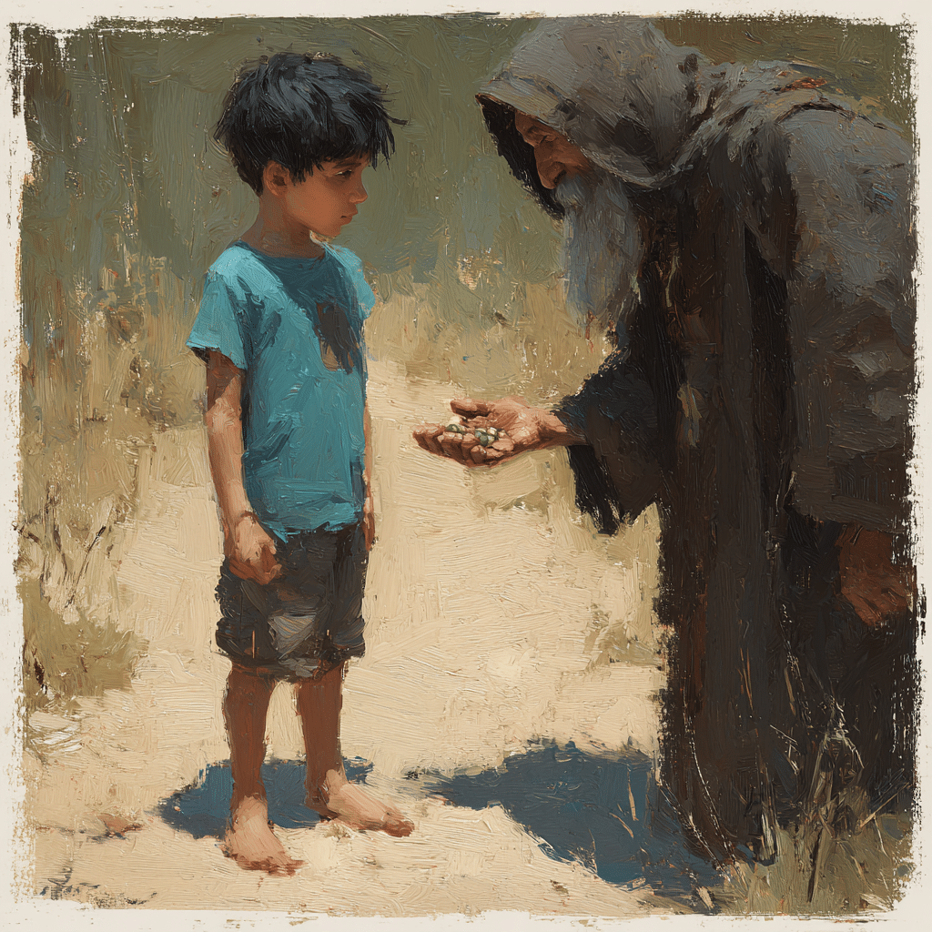 老人神秘地眨眨眼:”我知道很多事情哦!比如我知道你正要去集市賣掉這頭可憐的小花。”他從口袋裡掏出一樣東西,”看,我這裡有一些神奇的豆子,要不要換換看?”