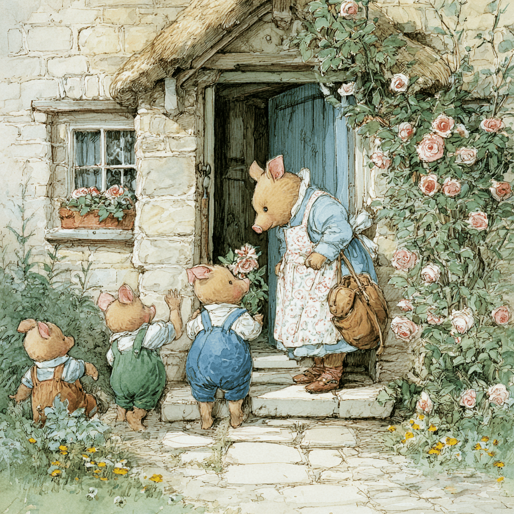 有一天,豬媽媽把他們叫來,溫柔地說:「我親愛的孩子們,你們長大啦!是時候蓋一間屬於自己的房子,學習獨立了。要記得,不管做什麼事,都要用心喔!」