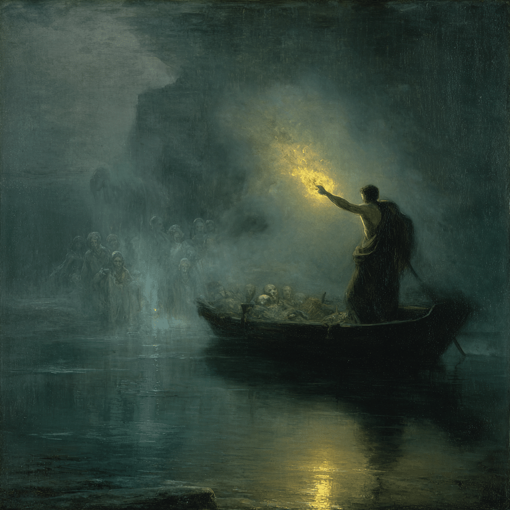 河邊停著一艘破舊的渡船,船上站著一個瘦骨嶙峋的老人,正是冥界的渡船夫卡戎。他的眼睛深陷,皮膚如同枯木樹皮,手中握著一根長長的船槳。