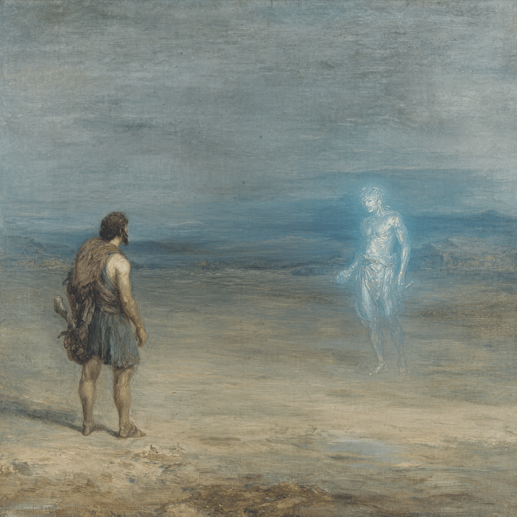兩個英雄就這樣在灰色的平原上道別,一個繼續走向冥界的深處,一個留在這片寧靜而蒼白的土地上,望著老友漸行漸遠的背影。